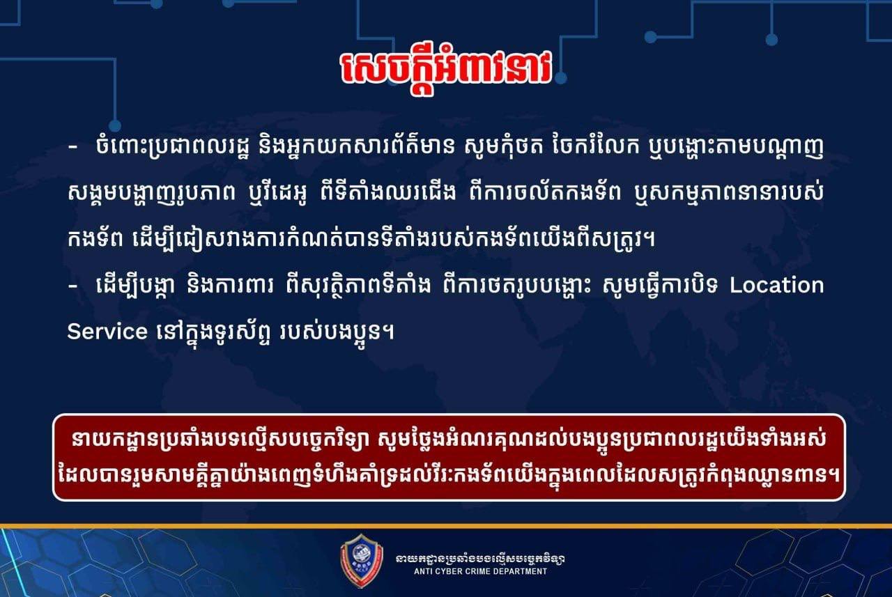 នគរបាលប្រឆាំងបទល្មើសបច្ចេកវិទ្យា អំពាវនាវដល់ពលរដ្ឋ សូមកុំថតចែករំលែក រូបភាព ឬវីដេអូ ពីទីតាំងឈរជើង ការចល័តកងទ័ព្វ ឬសកម្មភាពនានារបស់កងទ័ព្វ ដើម្បីជៀសវាងការកំណត់បានទីតាំងរបស់កងទ័ព្វយើងពីសត្រូវ ។