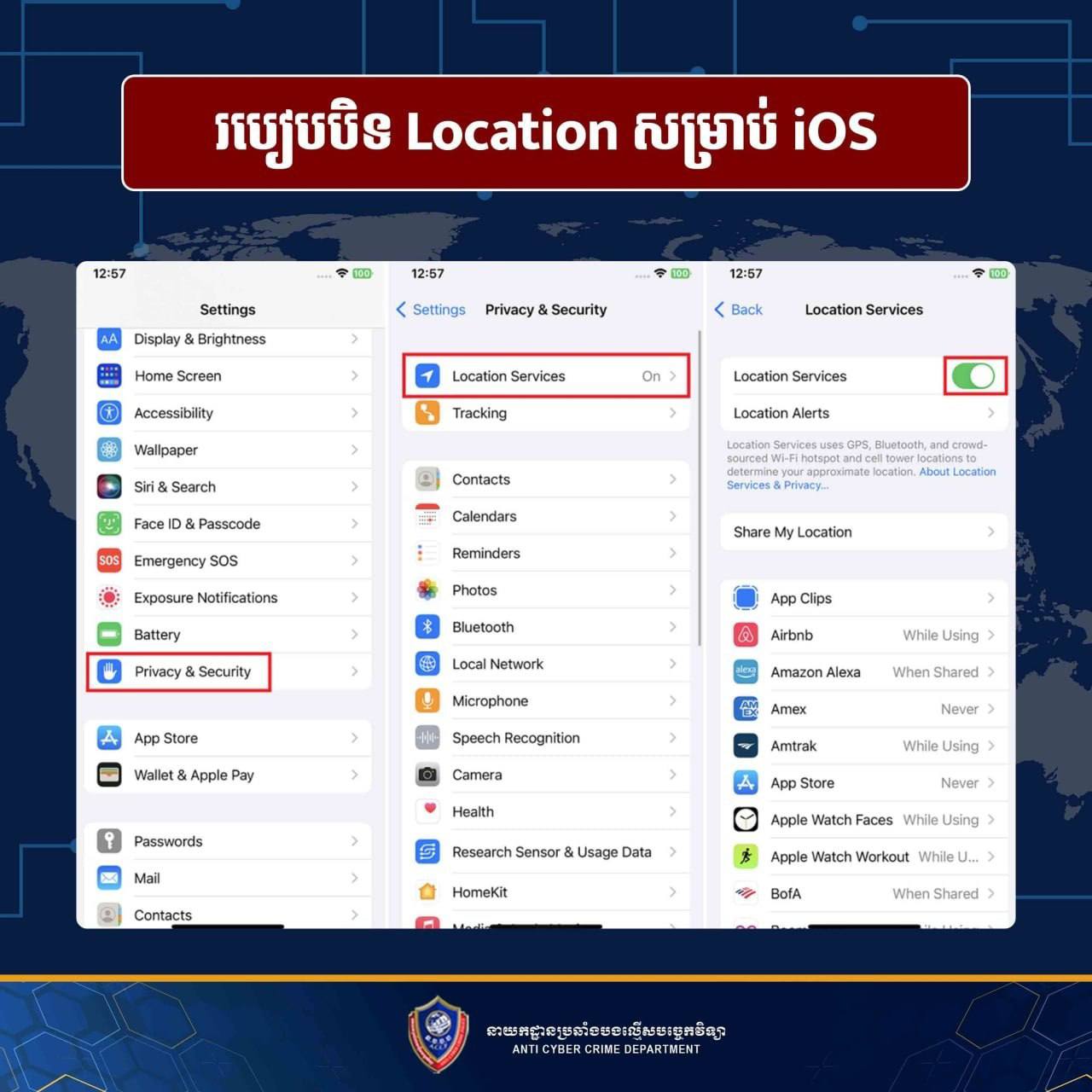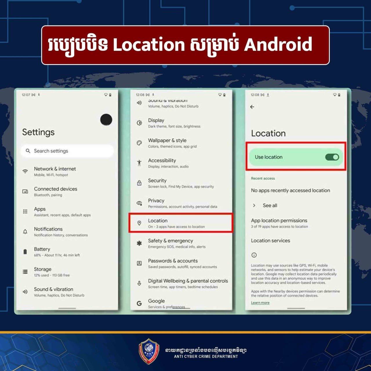 ដើម្បីបង្កា និងការពារ ពីសុវត្ថិភាពទីតាំង ពីការថតរូបបង្ហោះ សូមធ្វើការបិទ Location Service នៅក្នុងទូរស័ព្ទរបស់បងប្អូន ។