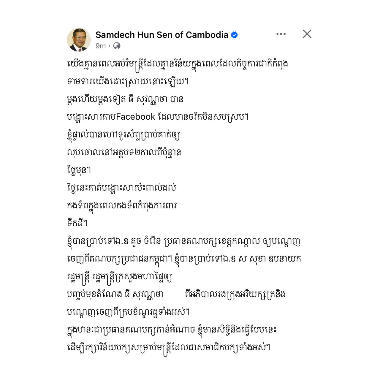 សម្ដេចតេជោ សម្រេចឱ្យបណ្ដេញ អ្នកនាង ធី សុវណ្ណថា ចេញពី គណបក្សប្រជាជនកម្ពុជា និងបញ្ចប់មុខតំណែងពីអភិបាលរងក្រុងអរិយក្សត្រ និងបណ្តេញចេញពីក្របខ័ណ្ឌរដ្ឋទាំងអស់តែម្ដង