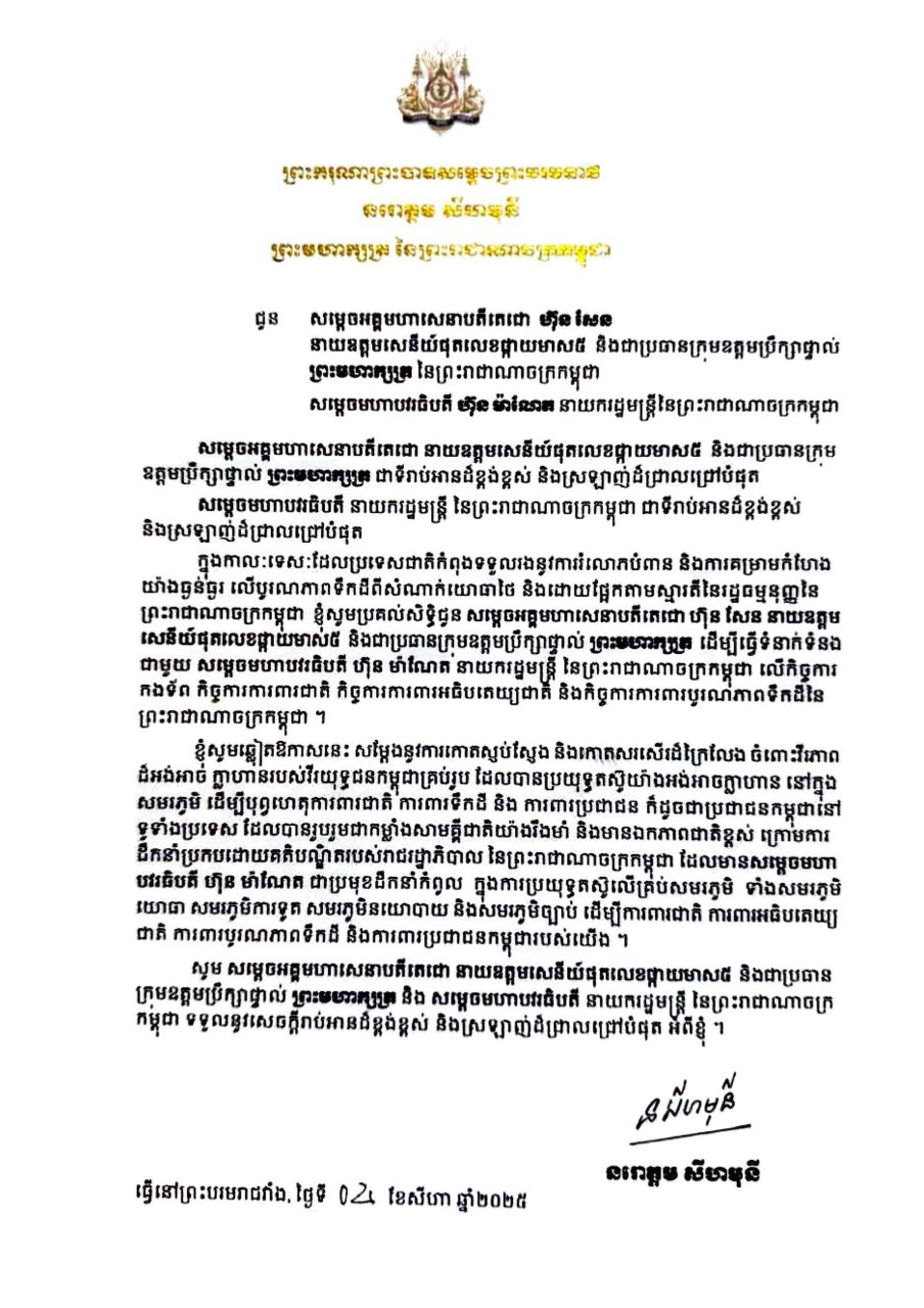 ព្រះរាជសារប្រគល់សិទ្ធិជូន សម្តេចតេជោ ហ៊ុន សែន ដើម្បីធ្វើទំនាក់ទំនងជាមួយ សម្តេចធិបតី ហ៊ុន ម៉ាណែត នាយករដ្ឋមន្ត្រី លើកិច្ចការកងទ័ព កិច្ចការការពារជាតិ កិច្ចការការពារអធិបតេយ្យជាតិ និងកិច្ចការការពារបូរណភាពទឹកដីនៃព្រះរាជាណាចក្រកម្ពុជា ។
