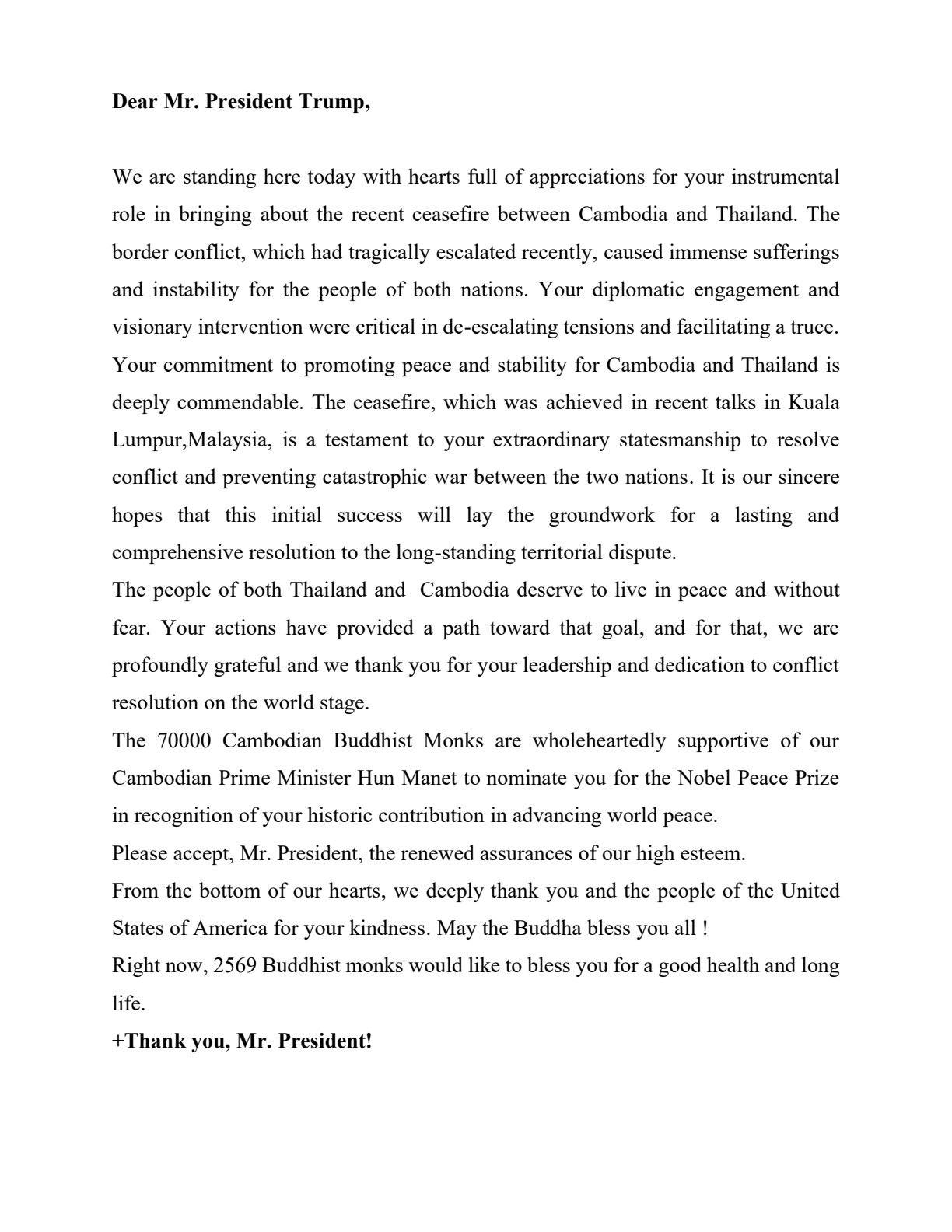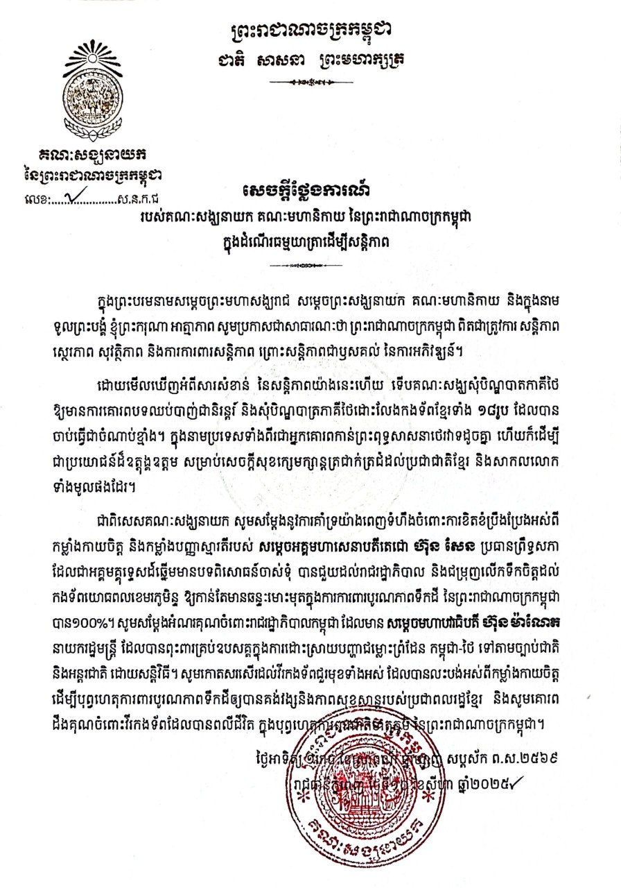 គណៈសង្ឃកម្ពុជាសុំបិណ្ឌបាដ្ឋភាគីថៃ ឱ្យមានការគោរពបទឈប់បាញ់ជានិរន្តរ៍ និងសុំបិណ្ឌបាដ្ឋភាគីថៃដោះលែងកងទ័ពខ្មែរទាំង ១៨ រូប ដែលត្រូវបានចាប់ធ្វើជាចំណាប់ខ្មាំង ។