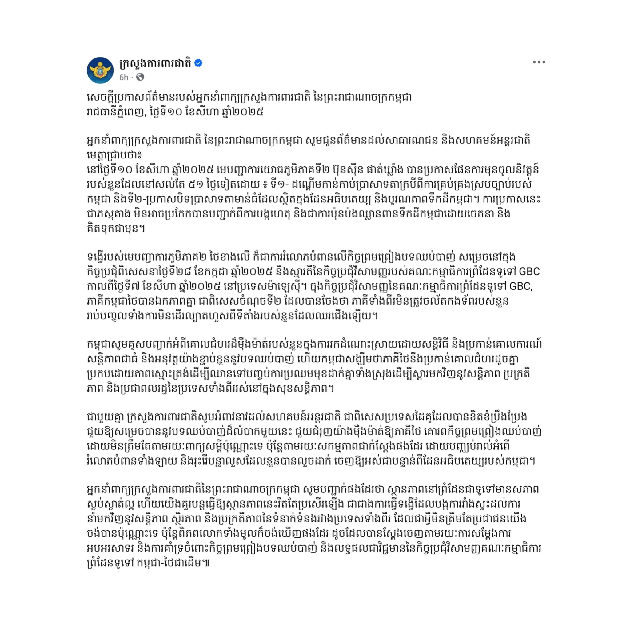 ទង្វើនេះ ក៏ជាការរំលោភបំពានលើកិច្ចព្រមព្រៀងបទឈប់បាញ់ និងស្មារតីនៃកិច្ចប្រជុំ GBC កាលពីថ្ងៃទី៧ ខែសីហា ឆ្នាំ២០២៥ នៅប្រទេសម៉ាឡេស៊ីផងដែរ។