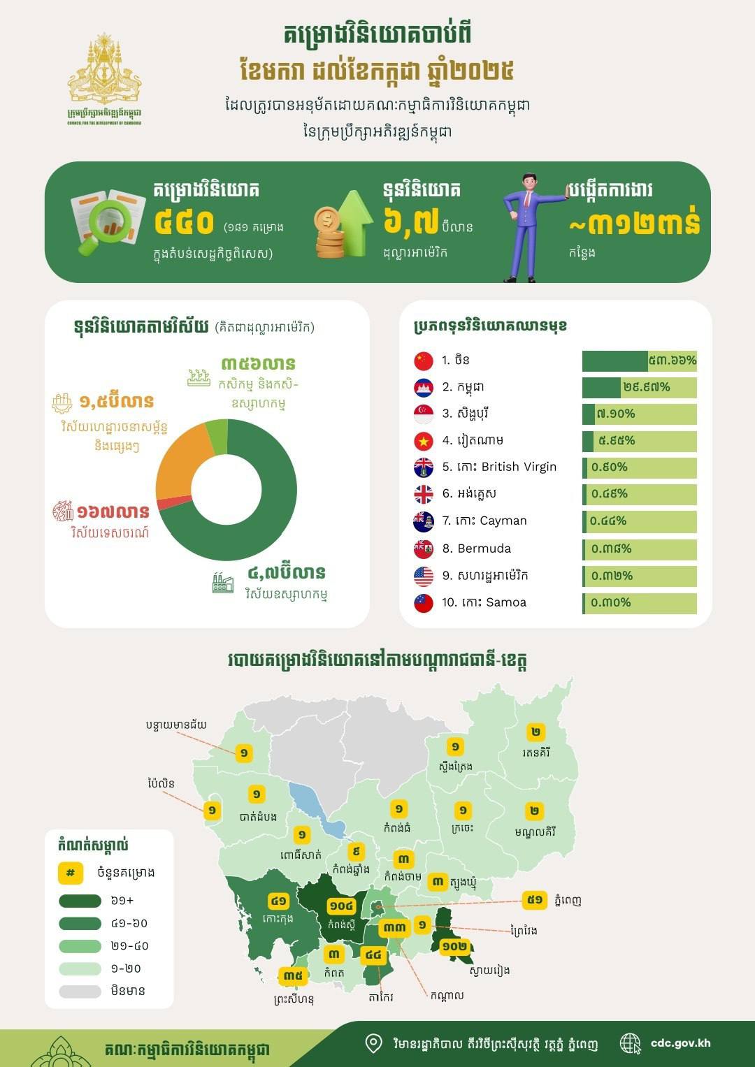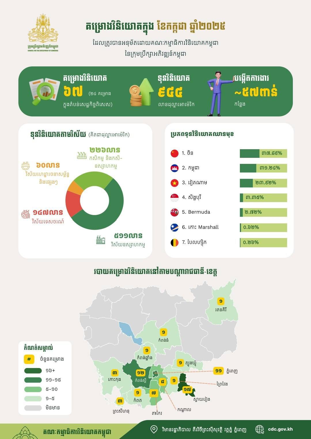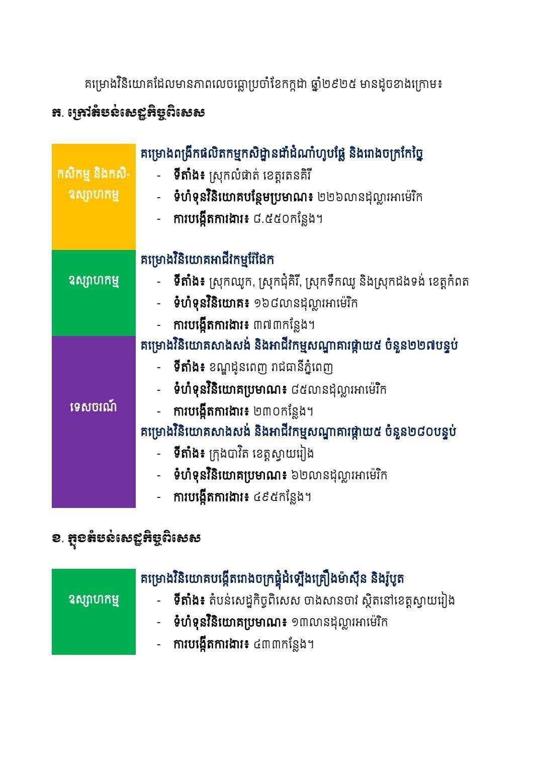 គម្រោងវិនិយោគចំនួន ៦៧ ក្នុងទំហំទុនវិនិយោគសរុបប្រមាណ ៩៤៤ លានដុល្លារអាម៉េរិក ត្រូវបានចុះបញ្ជីដោយគណៈកម្មាធិការវិនិយោគកម្ពុជានៃក្រុមប្រឹក្សាអភិវឌ្ឍន៍កម្ពុជា ក្នុងខែកក្កដា ឆ្នាំ ២០២៥ ។
