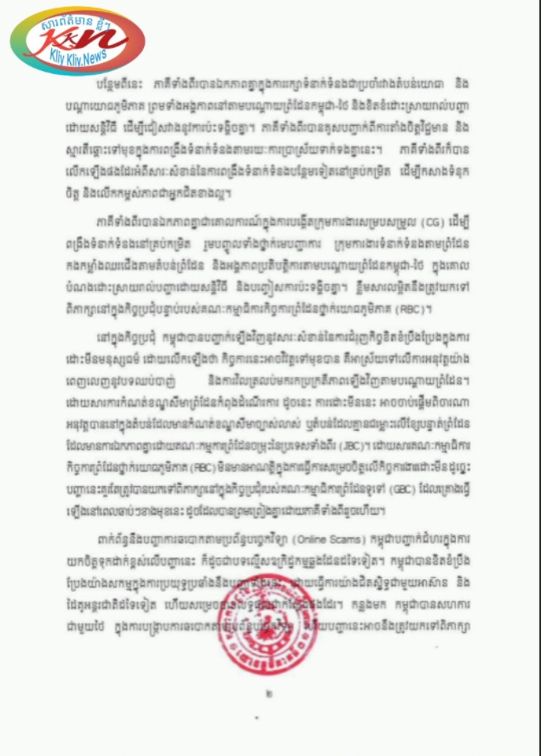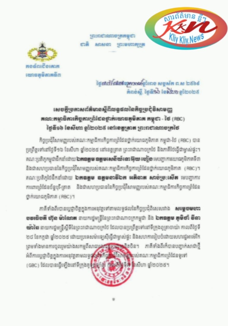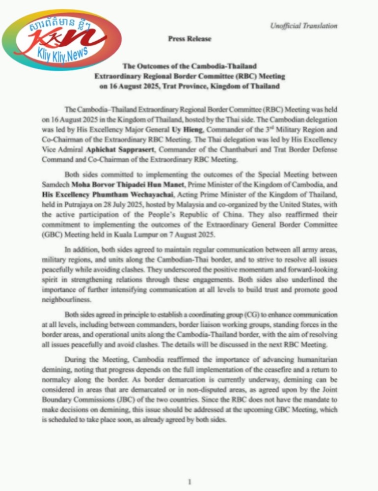 សេចក្តីប្រកាសព័ត៌មានស្តីពីលទ្ធផលនៃកិច្ចប្រជុំវិសាមញ្ញ គណៈកម្មាធិការកិច្ចការព្រំដែនថ្នាក់យោធភូមិភាគ កម្ពុជា-ថៃ (RBC) ថ្ងៃទី ១៦ ខែសីហា ឆ្នាំ ២០២៥ នៅខេត្តត្រាត ព្រះរាជាណាចក្រថៃ