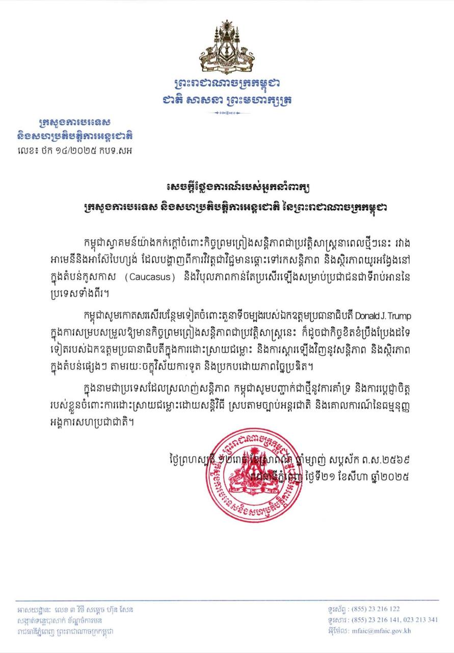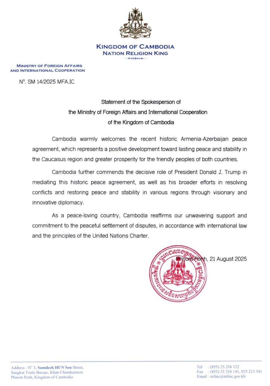 កម្ពុជាស្វាគមន៍យ៉ាងកក់ក្តៅចំពោះកិច្ចព្រមព្រៀងសន្តិភាពជាប្រវត្តិសាស្ត្រនាពេលថ្មីៗនេះ រវាងអាមេនីនិងអាស៊ែបៃហ្សង់ ដែលបង្ហាញពីការវិវត្តជាវិជ្ជមានឆ្ពោះទៅរកសន្តិភាព និងស្ថិរភាពយូរអង្វែងនៅ ក្នុងតំបន់កូសកាស (Caucasus) និងវិបុលភាពកាន់តែប្រសើរឡើងសម្រាប់ប្រជាជនជាទីរាប់អាននៃ ប្រទេសទាំងពីរ ។