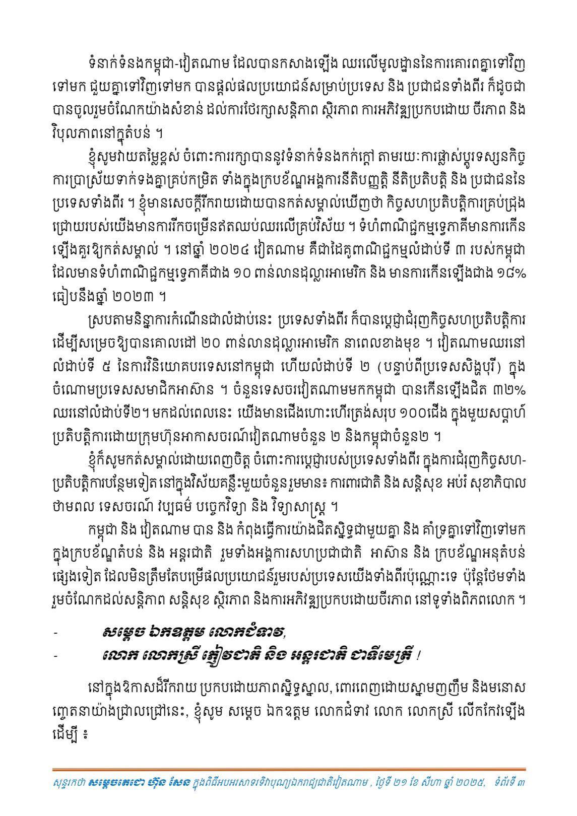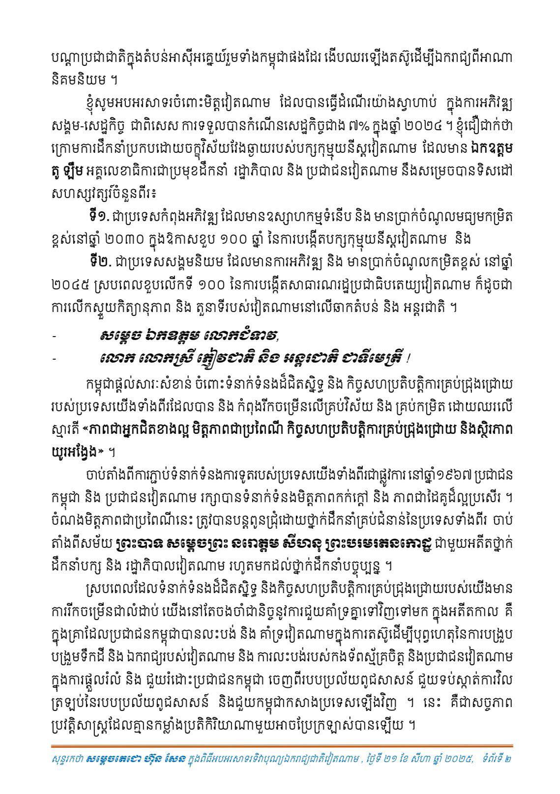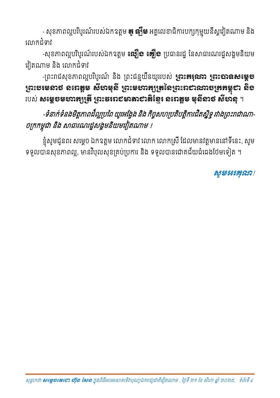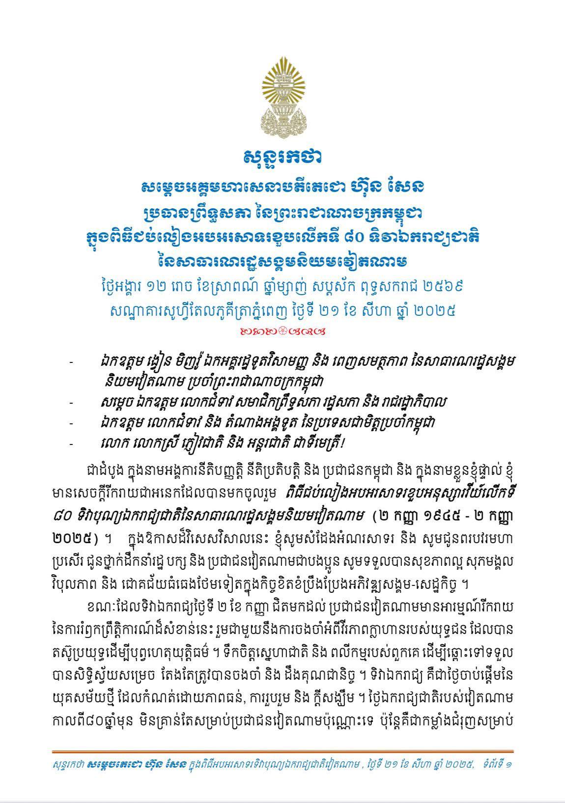 សុន្ទរកថា សម្ដេចតេជោ ក្នុងពិធីអបអរសាទរខួបលើកទី ៨០ ទិវាឯករាជ្យជាតិនៃសាធារណរដ្ឋសង្គមនិយមវៀតណាម Post published:August 21, 2025 Post category:ព័ត៌មានជាតិ https://kliykliy.news/wp-content/uploads/2025/08/VID-20250821-WA0014.mp4 សុន្ទរកថា សម្ដេចតេជោ ហ៊ុន សែន ប្រធានព្រឹទ្ធសភាកម្ពុជា ក្នុងពិធីអបអរសាទរខួបលើកទី៨០ ទិវាឯករាជ្យជាតិនៃសាធារណរដ្ឋសង្គមនិយមវៀតណាម ។ You Might Also Like សេចក្តីជូនដំណឹង October 25, 2025 អ្នកនាំពាក្យក្រសួងការពារជាតិកម្ពុជា នៅថ្ងៃទី ១២ និងថ្ងៃ ១៣ ខែសីហា ឆ្នាំ ២០២៥ August 13, 2025 លោក ម៉ៅ ឌុង ប្រធានសហភាពសហព័ន្ធយុវជនកម្ពុជាខេត្តត្បូងឃ្មុំ ដឹកនាំ សមាជិក-សមាជិកា ស.ស.យ.ក ខេត្ត ចូលរួមកាន់បិណ្ឌវេនទី១ នៅវត្តតេជបារមីសិរីសុខារាម (ហៅវត្តតេជសុវណ្ណភូមិ) September 8, 2025
