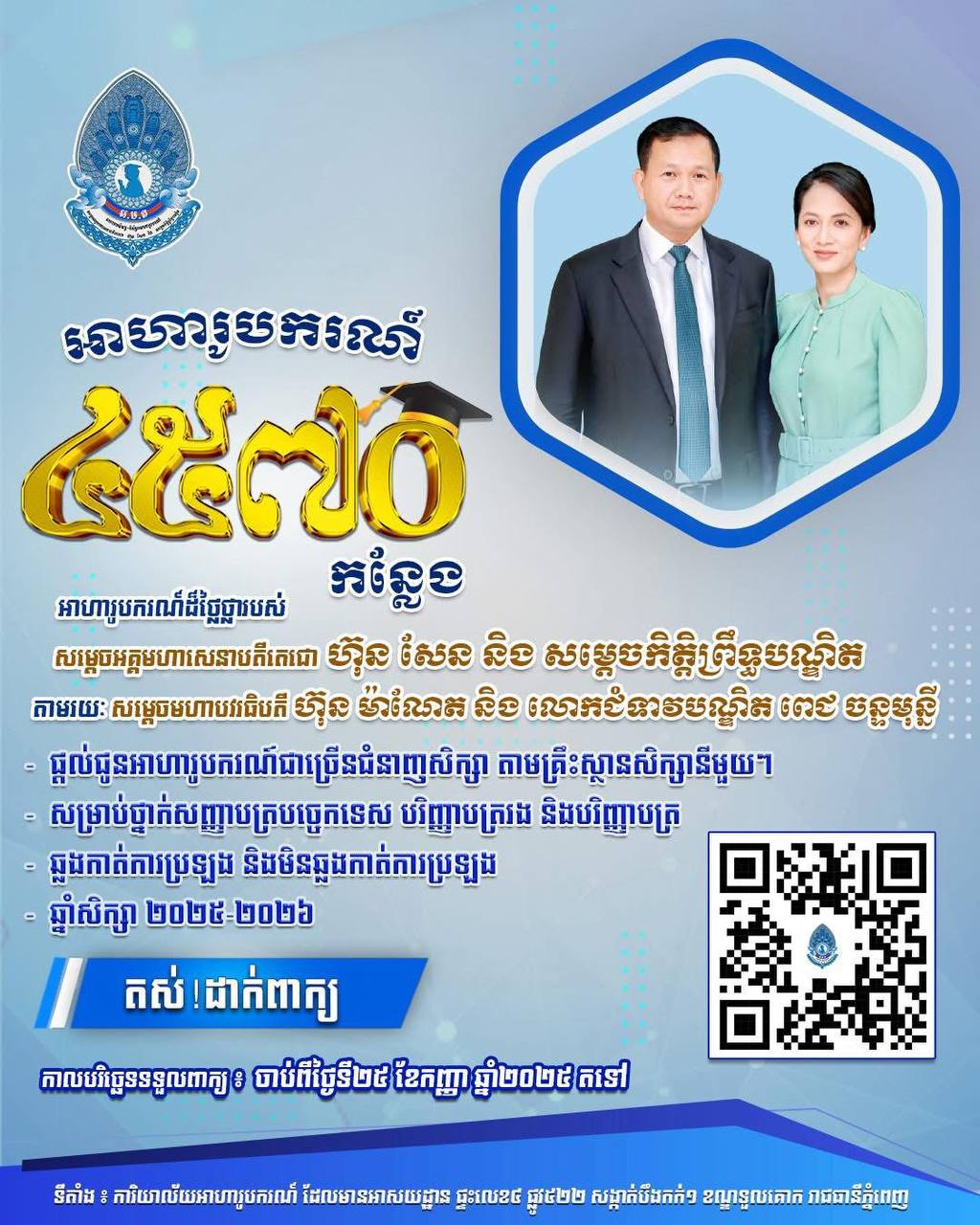 សម្តេចមហាបវរធិបតី ហ៊ុន ម៉ាណែត និងលោកជំទាវបណ្ឌិត ពេជ ចន្ទមុន្នី ហ៊ុនម៉ាណែត ផ្តល់អាហារូបករណ៍ដ៏ថ្លៃថ្លារបស់ សម្តេចអគ្គមហាសេនាបតីតេជោ ហ៊ុន សែន និងសម្តេចកិត្តិព្រឹទ្ធបណ្ឌិត (អ.ម.ត) ចំនួន ៤.៥៧០ កន្លែង សម្រាប់ថ្នាក់សញ្ញាបត្របច្ចេកទេស បរិញ្ញាបត្ររង និងបរិញ្ញាបត្រ ឆ្នាំសិក្សា ២០២៥-២០២៦ ដោយឆ្លងកាត់ការប្រឡង និងមិនឆ្លងកាត់ការប្រឡង ។