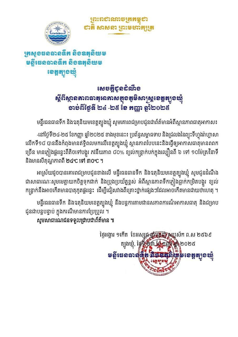 រៀបចំដោយមន្ទីរធនធានទឹក និងឧតុនិយម ខេត្តត្បូងឃ្មំ