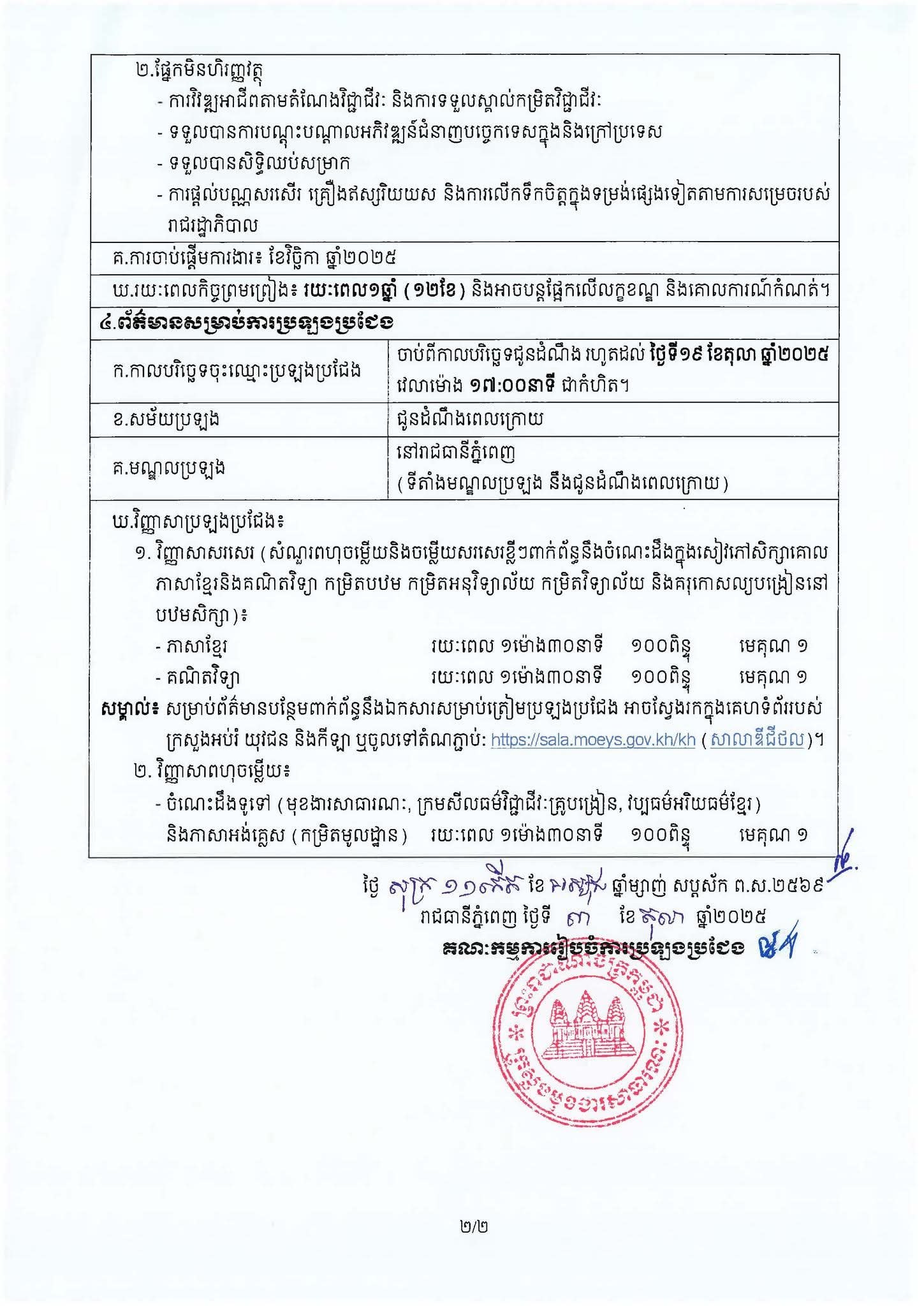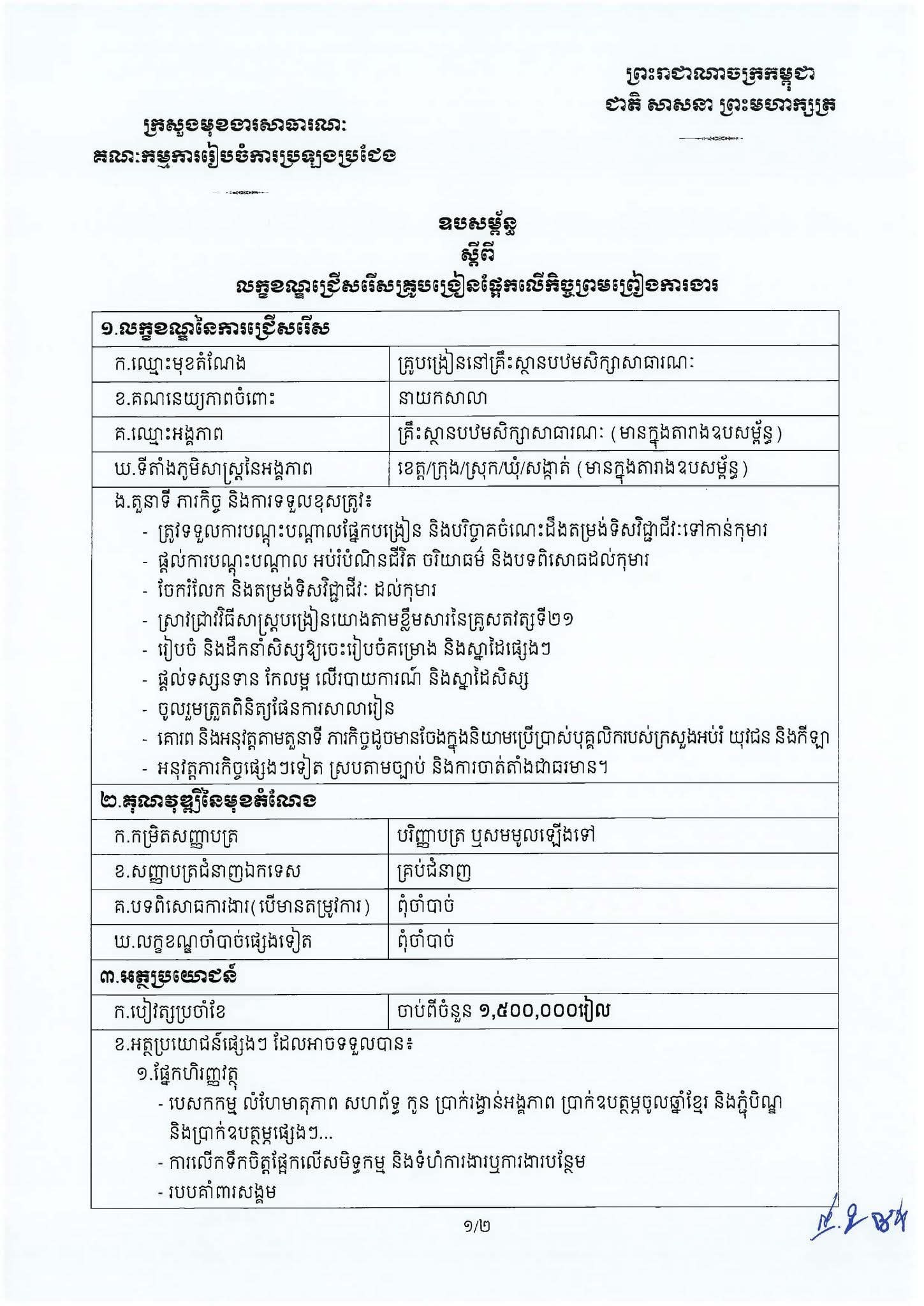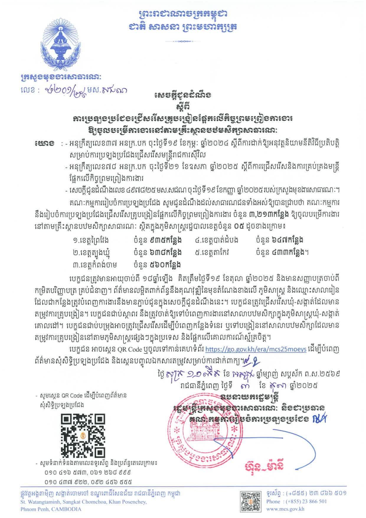 ក្រសួងមុខងារសាធារណៈ នឹងរៀបចំការប្រឡងប្រជែងជ្រើសរើស «គ្រូបង្រៀនផ្អែកលើកិច្ចព្រមព្រៀងការងារ» ចំនួន ៣.២១៣ កន្លែង ឱ្យចូលបម្រើការងារនៅតាមគ្រឹះស្ថានបឋមសិក្សាសាធារណៈ ស្ថិតក្នុងភូមិសាស្ត្ររដ្ឋបាលខេត្តព្រៃវែង ខេត្តត្បូងឃ្មុំ ខេត្តកំពង់ចាម ខេត្តបាត់ដំបង និងខេត្តតាកែវ ។